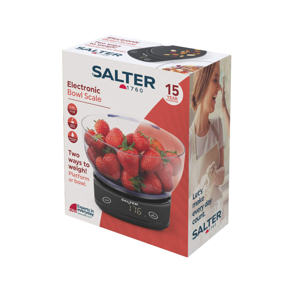 Whether you need to weigh milk, flour, sugar or fruit this Salter kitchen scale has two ways to weigh! Perfect for baking, this digital food scale has an add-and-weigh feature to measure multiple ingredients together either directly onto the platform or in the 1.8L dishwasher-safe bowl! With a 5kg/11lbs maximum capacity, you can weigh both wet and dry ingredients thanks to the Aquatronic function and measure precisely with an easy-to-read LCD display. MEASURE LIQUIDS: Ever left wondering where you went wrong in the recipe? Have you added too much milk or water than expected? Eliminate the guesswork with the Aquatronic feature and measure liquids precisely. TWO WAYS TO WEIGH: Weigh wet and dry ingredients in the 1.8L dishwasher safe bowl or directly onto the platform. Perfect for precise weighing, it has a 5kg / 11lbs maximum capacity and measurements are displayed on the easy-read LCD display. WEIGH STRAIGHT AWAY: This electronic food scale has batteries included so you can weigh straight away! This scale also comes with a 15-year guarantee so you can keep cooking for years to come ELECTRONIC KITCHEN SCALE: Make cooking fun for your family and create bakes and recipes for everyone to enjoy! From homemade biscuits and cakes, to fresh pizza dough and pie crusts. ADD & WEIGH: Measure multiple ingredients together at the same time! Use the add and weigh function to measure wet and dry ingredients together. Perfect when baking you can add both flour and milk!