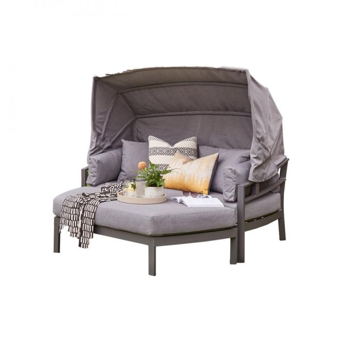 The Norfolk Leisure Titchwell Day Bed is an aluminium framed garden day bed that is extremely versatile combining a sofa with an adjustable hood and an ottoman. Enhanced by luxurious showerproof deep seating cushions, this daybed easily seats two and can be used as a sofa with the ottoman providing table space or the two can be pushed together to lounge comfortably in the sun. Dimensions: Day Bed Sofa: H73 x W176 x D85cm, Day Bed Ottoman: H28 x W156 x D60cm