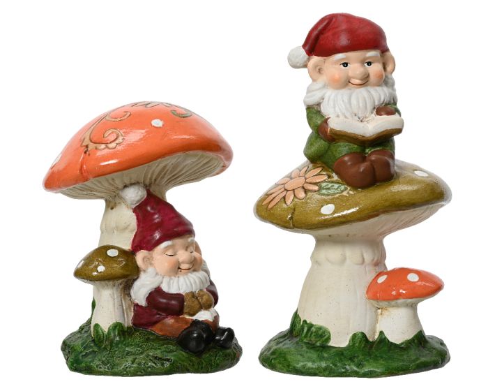 Gnome terracotta matt mix shiny 2ass sitting on mushroom - reading under mushroom Finish:matt mix shiny Handmade:Yes
