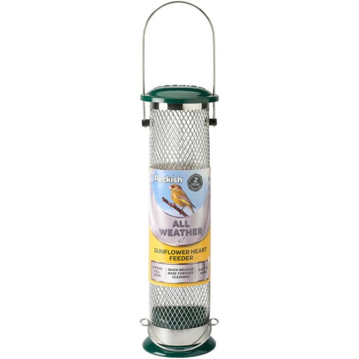 Peckish All Weather Sunflower Heart Feeder is perfect for feeding sunflower hearts and peanuts.. This feeder has a tough metal design to withstand the elements. The lid and base are made from durable alloy and it has a broad handle so you can hook it over branches large and small, or on purpose-built hooks. The quick release base ensures easy removal for cleaning.
