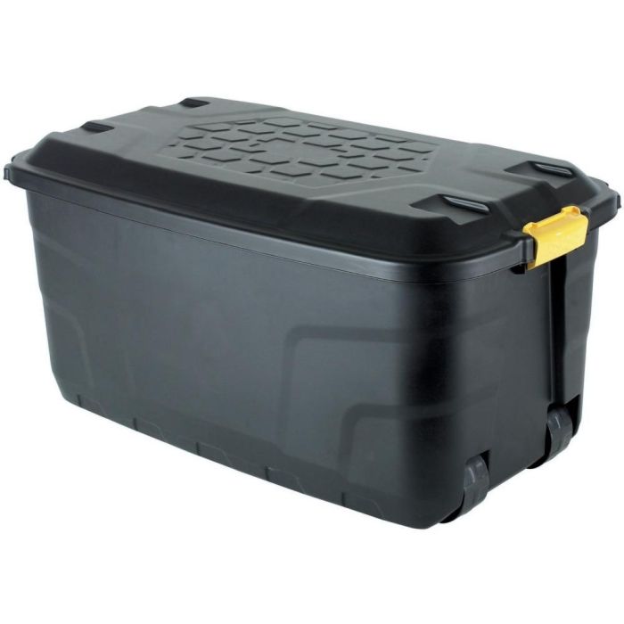 The Strata Heavy Duty Storage Trunk offers a 145L capacity, made from recycled plastic for strength and durability. Featuring four large wheels for easy movement, secure clip handles, and a padlockable lid for added security. Stackable design makes it ideal for garages, workshops, and DIY storage.