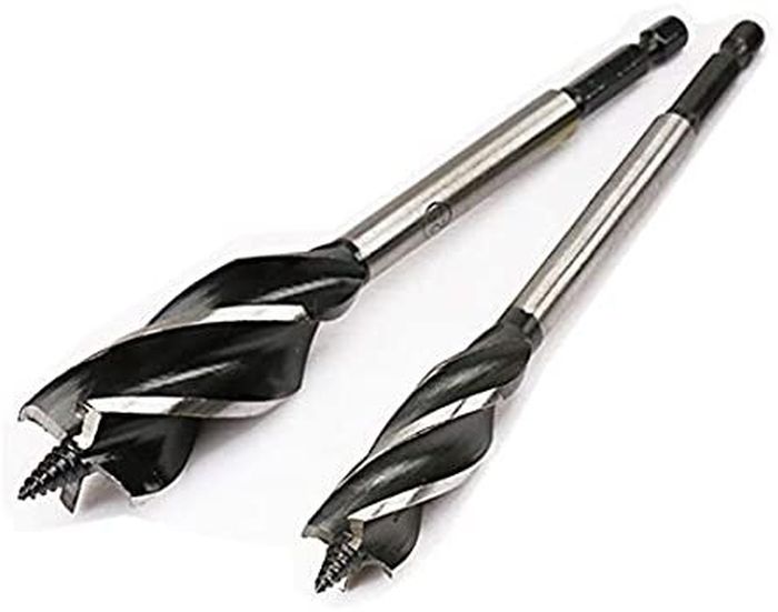 Hi Speed Augur bit 4 X Faster, Made from Chrome Vanadium Steel, Full screw tip for ease of use and pull through,Tapered flute for less binding Full length heat treated for extra durability, 1/4″ quick change shank adaptor and connector system.