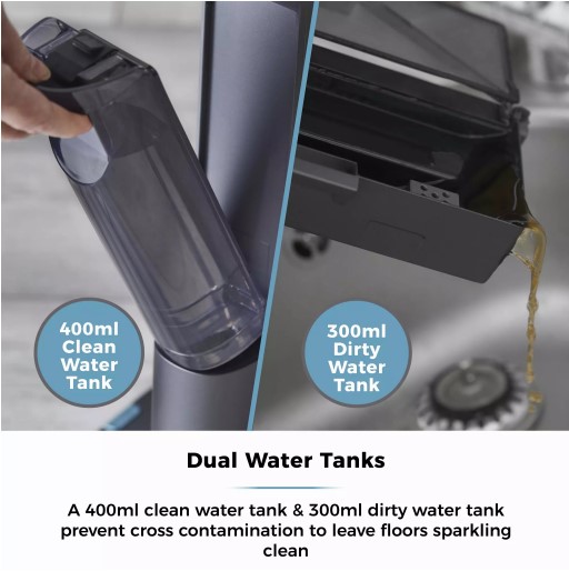 DUAL WATER TANKS Includes a 0.3 litre clean water tank and 0.4 litre dirty water tank to separate clean and dirty water, so there is no cross contamination to leave tiled, laminate and hard floors in pristine condition