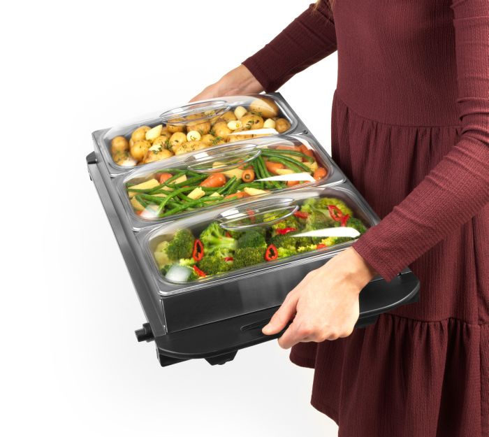 Keep Food Warm At Family Meals, Parties And Bbqs 300 W Power 2.5 Litre Capacity Per Pan 3 Stainless Steel Pans With Lids Adjustable Temperature Control Hot Plate With Cool Touch Handles Keeps Food Warm And Up To 3 Hours Portable And Lightweight