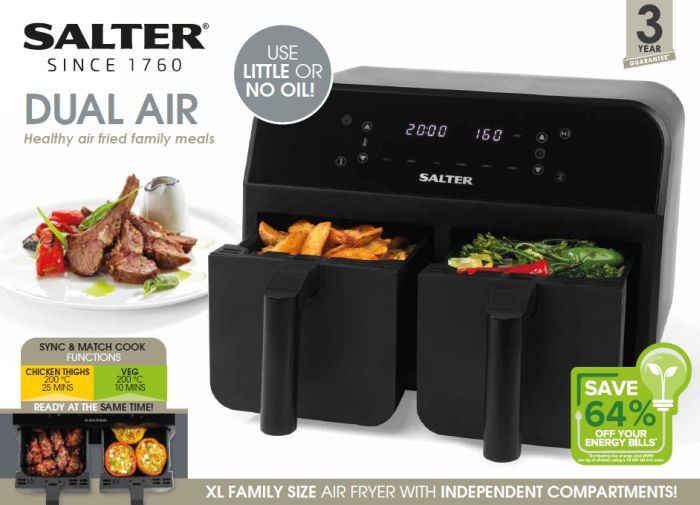Includes 2 X Frying Racks For Dual Independent Cooking With 6 Cooking Functions 60 Minute Timer 2400 W Of Power Can Hold Up To 7.4 L Capacity Adjustable Temperature Control Up To 240? And A Stylish Sensor Touch Control With Led