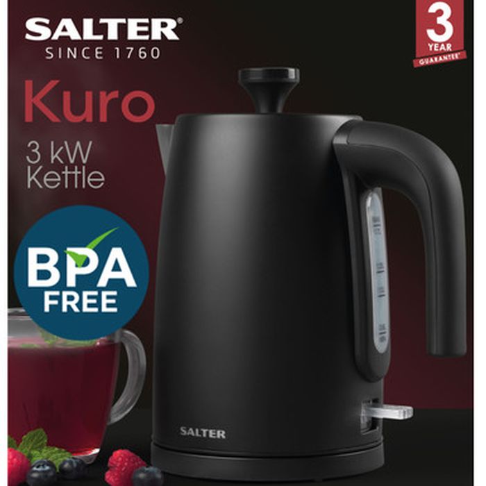 Make a perfect morning brew with the Kuro Electric Kettle from Salter; with 3 kW rapid boiling, your drink is ready to enjoy in minutes.Boasting an easy view water window and a 360° swivel base, this kettle ideal for left and right-handed uses and is simple to refill.The Strix controlled kettle also has inbuilt safety features such as the boil-dry sensor and auto-shut off for peace of mind.With a large 1.7 litre capacity, this Kuro kettle is great for busy families and entertaining guests with quick hot drinks.Get the set: combining everyday practicality with a sleek black design – the Kuro collection is a stunning addition to any home
