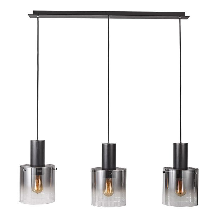 Sleek and sophisticated, this contemporary 3-light pendant fixture blends industrial charm with modern elegance. Featuring three cylindrical smoked glass shades suspended from a minimalist black canopy, each light showcases a visible filament-style bulb for a warm, ambient glow. H min260 – max1460 x W200 x L850mm Wattage 3 x 40W
