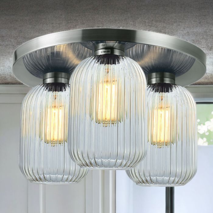 Satin Nickel Ceiling Light With 3 X Ribbed Clear Glass Skytech Pendants