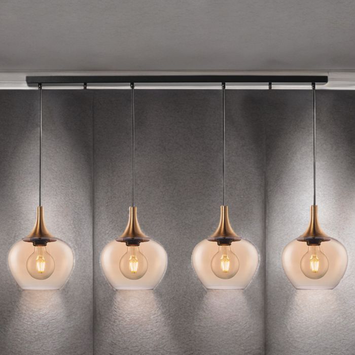 Elevate your space with the modern elegance of the PF2522-4AMB Pendant Light Fixture. This sophisticated ceiling light features four amber glass shades suspended from a sleek, matte black linear canopy. Each bulb is encased in a rounded, slightly teardrop-shaped glass shade with a warm amber tint, beautifully diffusing light and creating a cosy, ambient glow.