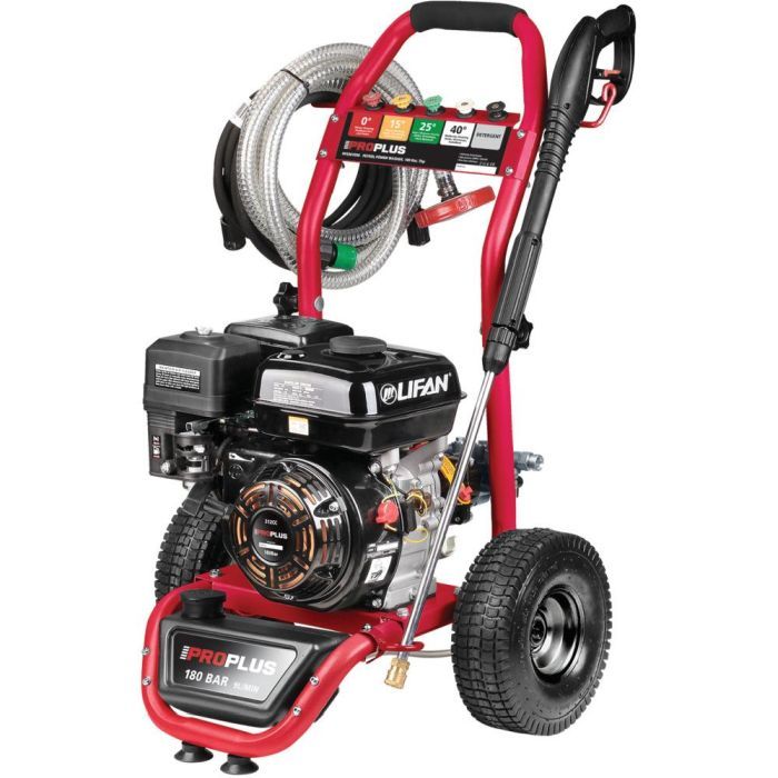 The ProPlus 7hp petrol washer includes a water pump which is suitable for using directly from a water barrel or by connecting directly to a water tap. Rated pressure 180bar with a flow rate of 9lt/min. It includes a metal lance with 5 assorted nozzles and a 3m suction hose with filter.