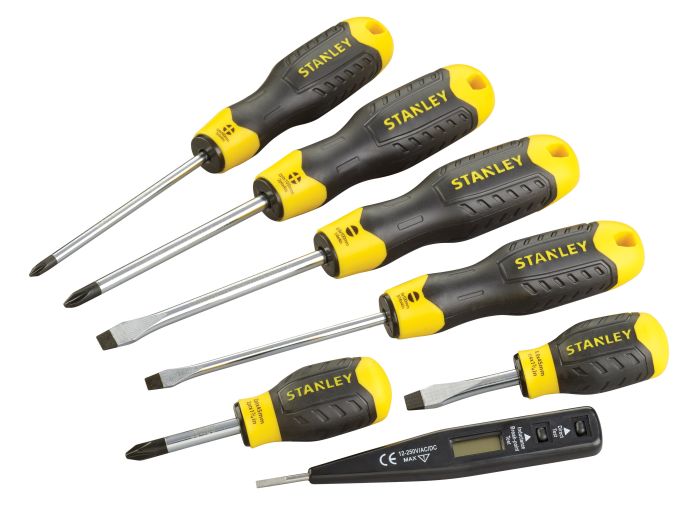The Stanley Cushion Grip screwdrivers with a chrome plated bar which is corrosion resistant and magnetic tips for easy pick up and screw locator. The soft grip handle provides excellent torque and comfort.. It has a smooth domed end for fast spinning action, speed and comfort and the large diameter handle offers greater torque which is needed for driving wood screws. Screw tip identification is shown on the handle.. Contents (plus free voltage tester):. 3 x Flared: 5.0 x 100mm, 6.5 x 45mm (stubby), 6.5 x 150mm. ,3 x Phillips: PH1 x 75mm, PH2 x 45mm (stubby), PH2 x 100mm. ,1 x Voltage Tester..