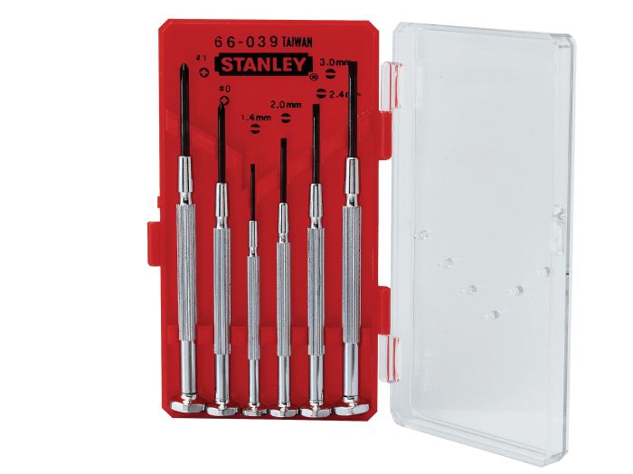 6 Piece Watchmaker Screwdriver Set with swivel-head handles and bright plated, fluted shafts for increased grip. Supplied with a plastic storage case.,Contains:,2 x Phillips: PH0, PH1,4 x Slotted: 1.4, 1.8, 2.3 & 3mm.