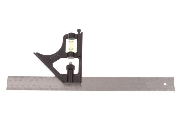 Combination square with metal body with three machined faces. The steel blade is stamped with metric and imperial sizes and is easy to read. Fitted with a 360° vial for all-round visibility and a scriber for convenience and marking out.. Can be used as a try and mitre square, depth or height gauge and spirit level.. Size: 300mm (12in).