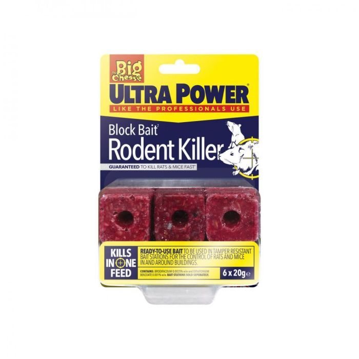 The Big Cheese Ultra Power Block Bait Rodent Killer Refills 6 x 20g Blocks - STV567 is fast acting, killing rats and mice in one feed. Bait refills for use with the following - STV565: Ultra Power Mouse Killer Station, STV566: Ultra Power Block Bait Rat Killer Station.