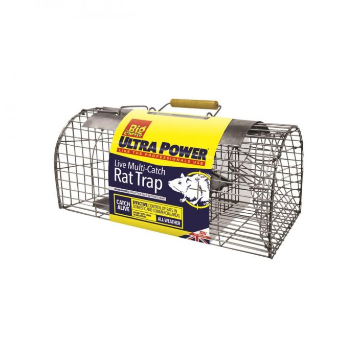 The Big Cheese Ultra Power Live Multi-Catch Rat Trap - STV080 has been designed with a self set mechanism that allows you to catch up to 5 rats in one setting once the unit is baited and in position. The two baiting stations in the trap help to entice the rats in before they fall through the trap door. The trap has a galvanised mesh construction which has been machine-finished to ensure there are no sharp edges. Bait with The Big Cheese Mouse & Rat Attractant - STV163.
