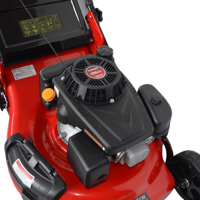 Built for efficiency and comfort, the WYZ22H2V boasts a 196cc Loncin engine and 56cm cutting width. Its 5-position central height adjustment, 75L nylon grassbox, and 3.8km/h self-propelled drive make it a versatile choice for larger lawns.